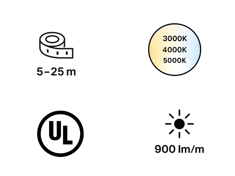Continuous, dot-free COB LED strips for clean architectural lines of light, available in indoor and outdoor IP-rated options, RGB/RGBW, high efficiency, and specialty addressable models.